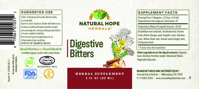 Bitter is a taste most of us avoid, but bitter is the taste that stimulates the entire digestive process, including HCL, bile, liver, pancreatic, and small intestine secretions. Natural Hope Herbals Digestive Bitters feature a blend of bitter and warming herbs to support healthy digestive function on a daily basis. Bitters are best taken directly, or diluted in a mouthful of water, a few minutes before meals.